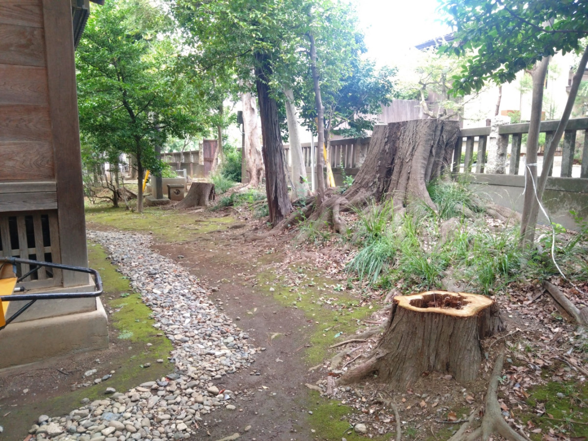氷川神社境内の切り株 樹木が老齢化し世代交代が進む