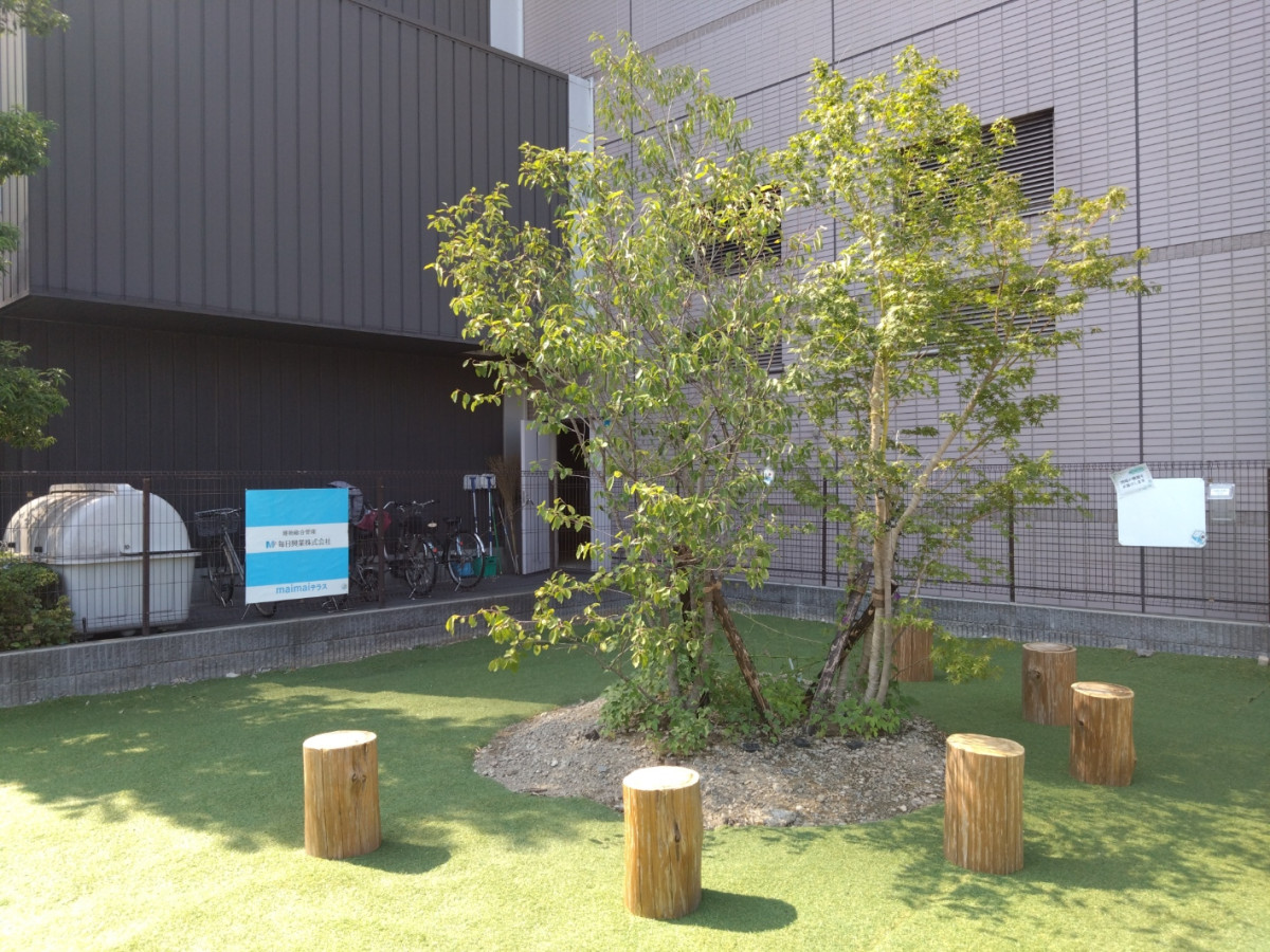 「木陰に人が集まって新しい縁がつながる」というイメージに基づく取り組みは、同社の新ビル建設プロジェクト「八百毎屋(やおごとや)プロジェクト」でも行われている。建設予定地は現在、ジューンベリー、モミジ、カシの木の三種の樹木を植え、端材を利活用した丸太イスを並べた広場「maimai(マイマイ)テラス」として一般に開放している。同プロジェクト担当の清水千夏さんは「同ビルは街のためになる、人間らしいビルを目指して、地域の方々の声を聞きながら事業内容を決めていきたい。着工予定の来年6月まで毎月第1日曜にイベントを開催する予定。会社と地域のご縁、人と人のご縁づくりに“木陰の休憩所”がつながりのきっかけになれば」と期待する。