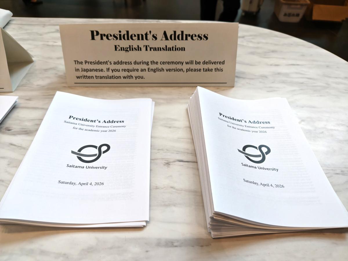 留学生向けに英文の「学長式辞」も配布された