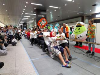 JR大宮駅の東西連絡通路で10月13日、「大宮駅東口・西口対抗連結大綱引き大会」が行われた。