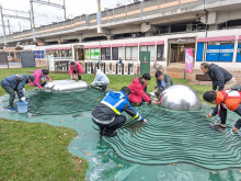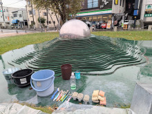アート清掃イベント「与野本町駅前公園のパブリックアートを洗おう!」が10月11日、与野本町駅前公園(さいたま市中央区本町東1)アートストリートエリアで開催された。