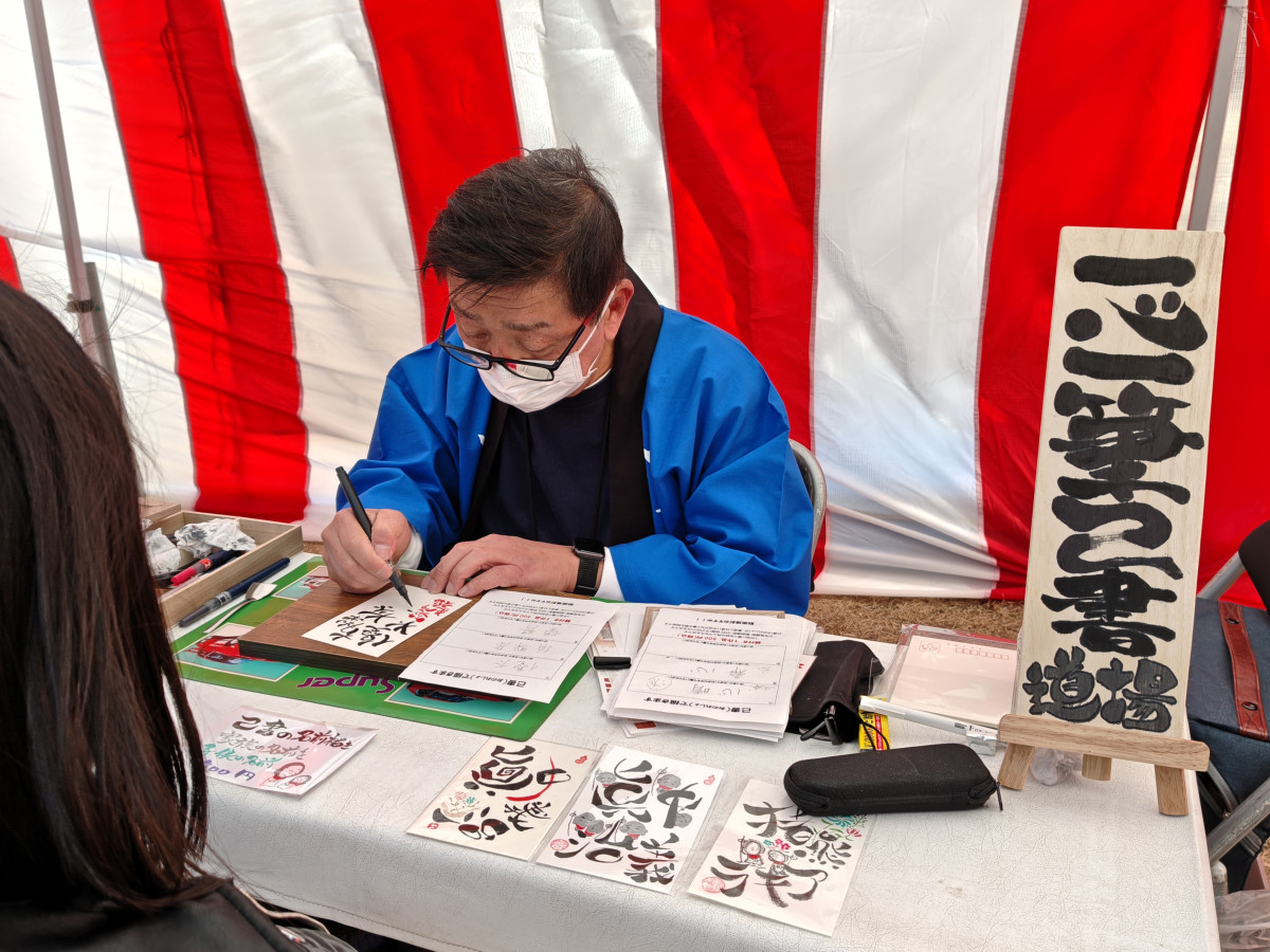 「岩槻流しびな」眞中義治さんによる己書コーナー
