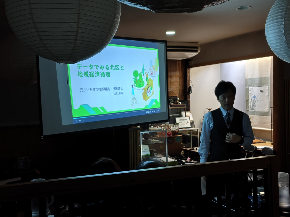「土呂エリア地域交流会」さいたま市北区の経済状況を解説する片倉さん