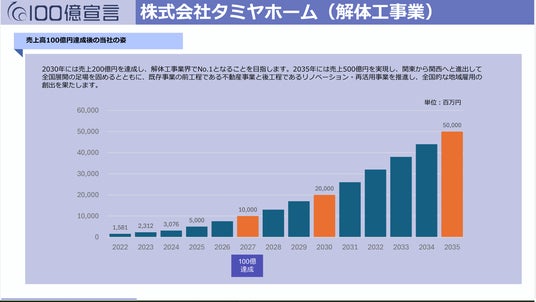 2030年売上高200億円、そして解体工事業界No.1という目標は、2025年度の売上見込み50億円という確かな成長の道筋の上にあります。さらに2035年売上高500億円の実現に向けては、関東から関西へと進出し、既存の解体事業の前工程となる不動産事業と、後工程となるリノベーション・再活用事業を推進することで、全国的な地域雇用の創出にも貢献してまいります。この革新的な事業モデルと、多様性を力に変える強い組織力があれば必ず実現できると確信しています。