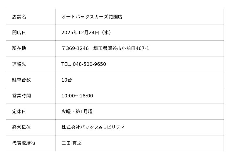 株式会社オートバックスセブン(代表取締役 社長:堀井勇吾)の連結子会社(孫会社)である株式会社バックスeモビリティ(代表取締役社長:三田真之)は、輸入車を中心とした車買取・販売店「オートバックスカーズ花園店」を2025年12月24日(水)に新規オープンします。