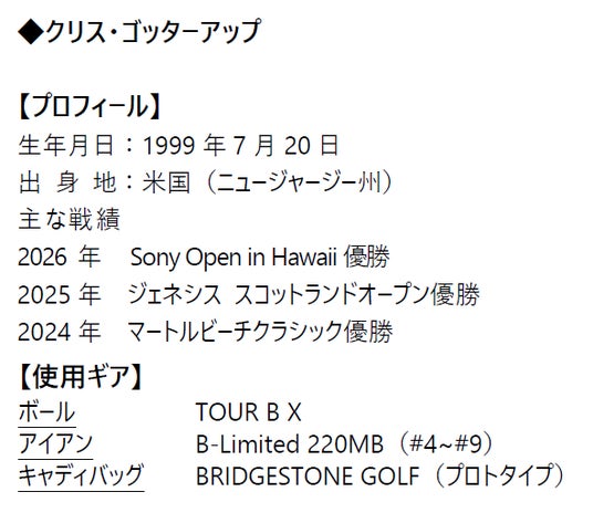 今回の優勝は、自分のゴルフキャリアの中で非常に価値のある勝利となりました。ブリヂストンのNEW『TOUR B X』は、ドライバーショットにおいて過去最高の飛距離とボールスピードを与えてくれました。また、グリーン周りでのアプローチのコントロール性能も素晴らしく、今まで使用したボールの中で一番のボールです。今後も勝利を積み重ねられるよう、頑張りたいと思います。