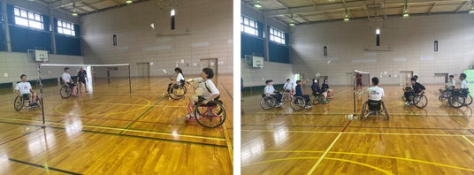 車いすバドミントンの競技では、普段立って行うバドミントンの位置と比べると車いすに座ってプレーをする分ラケットの位置も低く、ネットにシャトルが引っ掛かってしまうケースが多いです。車いすバスケット―ボールと同様に最初は難しそうな生徒たちでしたが、プレーを続けるとすぐに慣れ、楽しそうにラケットを振るう 姿が印象的でした。