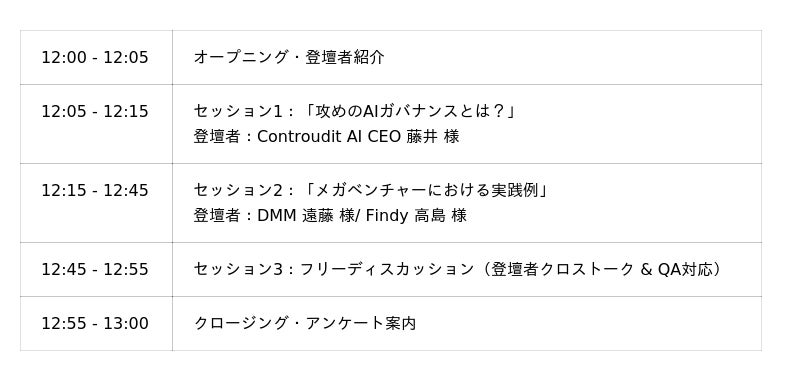 今回のウェビナーでは、メガベンチャーであるFindy・DMM.comの事例を交えながら、“AI活用を止めない”リスクマネジメント術を具体的に解説いたします。