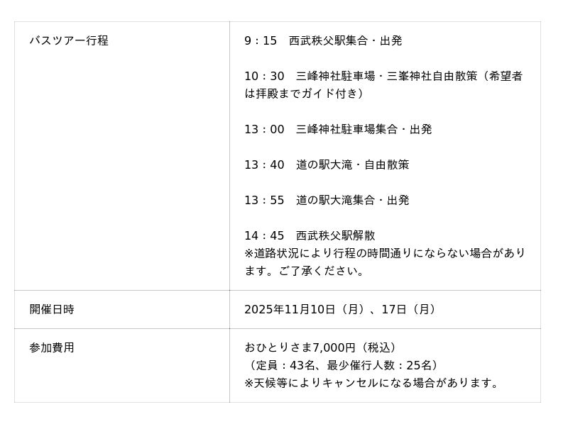 観光庁が選定する先駆的DMO法人 一般社団法人 秩父地域おもてなし観光公社(本社:埼玉県秩父市 会長:清野和彦)は、「大滝地区応援!三峯神社&道の駅大滝 バスツアー」の販売を行っています。このバスツアーは、秩父地域でも人気の三峯神社へ西武秩父駅から専用バスで座って行くことができ、神社に到着すると希望者へガイドが説明しながら拝殿まで行くことができます。