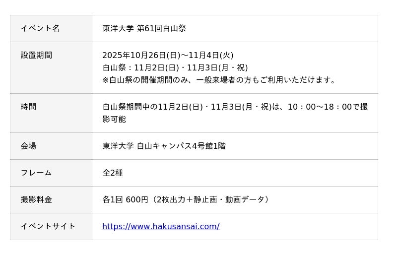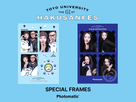 2025年11月2日(日)・11月3日(月・祝)の2日間で開催される東洋大学 第61回白山祭に合わせて、イベント限定のオリジナルフレームで撮影できるフォトブースを2025年10月26日(日)から設置しています。白山祭のマスコットキャラクター「しろやまさん」がデザインされたキュートなオリジナルフレーム2種を販売。撮影した画像は、プリントされるほか撮影後に表示されるQRコードからダウンロードが可能です。なお、本ブースは白山祭開催前の10月26日(日)から設置を開始します。白山祭での思い出はもちろん、キャンパスでの日常を、カタチに残る1枚の写真にするのはいかがでしょうか。