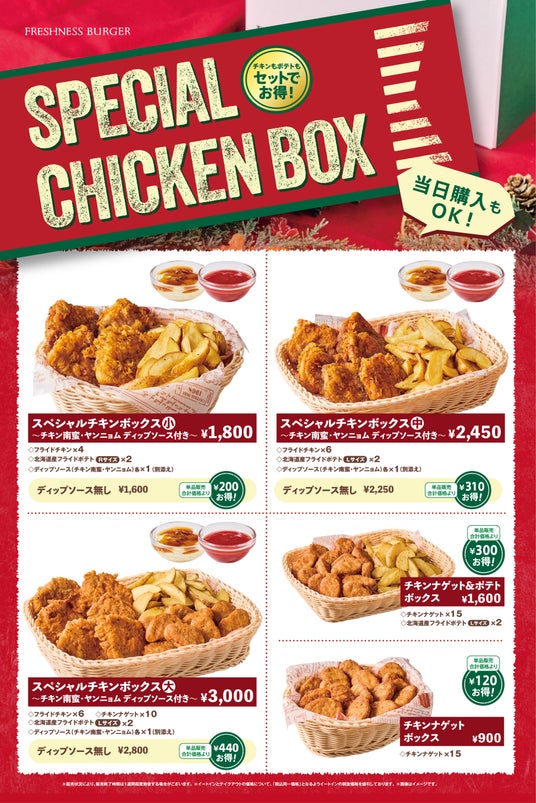 今年は、店内調理にこだわったフライドチキンを2種のディップソース(チキン南蛮/ヤンニョム)で味変して楽しめる、小・中・大のサイズから選べるボックスが登場。また、チキンナゲットをメインとした「チキンナゲット&ポテトボックス」や「チキンナゲットボックス」など、様々な利用シーンで楽しめるラインナップをご用意しました。