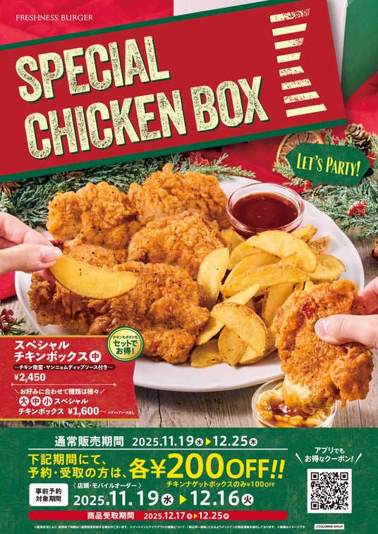 コロワイドグループの株式会社フレッシュネス(代表取締役社長:齋藤 健太朗/本社:神奈川県横浜市西区)は、2025年11月19日(水)より、ハンバーガーチェーン「フレッシュネスバーガー」にてホームパーティーやクリスマスにぴったりな「スペシャルチキンボックス」を期間限定で販売いたします。