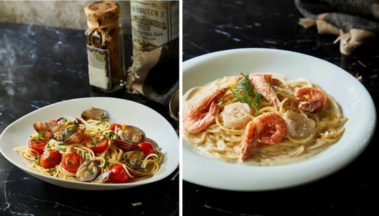 画像左:活あさりとチェリートマトのボンゴレマッキャート 画像右:海老と帆立のアマルフィ風 レモンクリーム