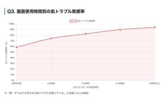 - 画面使用時間が長いほど肌トラブル実感率が高まる傾向があり、10時間以上では93.9%に達する