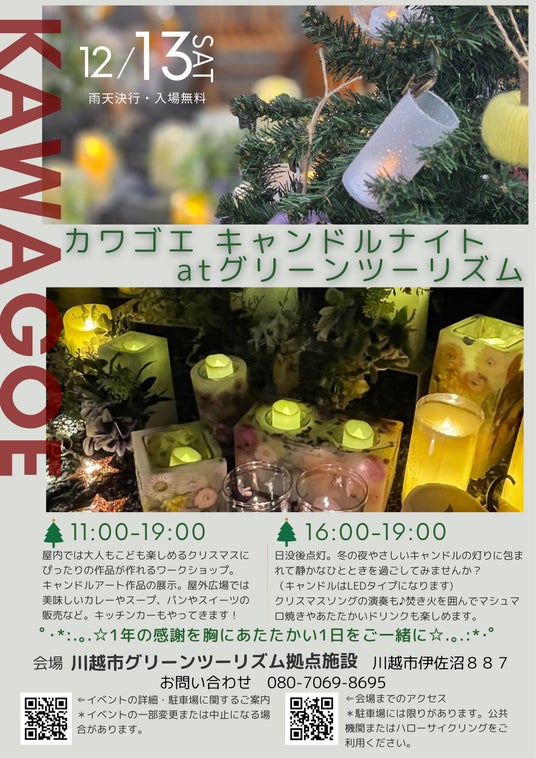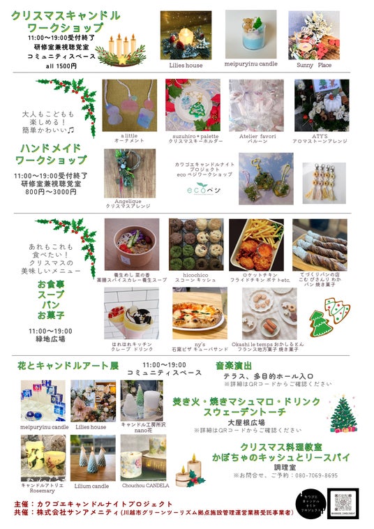 屋内では大人も子供も楽しめるクリスマスにぴったりの作品が作れるワークショップ。キャンドルアート作品の展示。屋外広場ではキッチンカーやパンやお菓子の販売もあります。