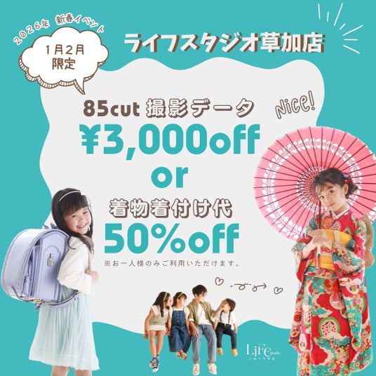 埼玉県草加市のフォトスタジオ「ライフスタジオ草加店」では、2026年1月4日(日)~2月28日(土)の期間限定で、撮影データ3,000円OFF または お着付け代50%OFF(1名様) が選べる新春キャンペーンを開催します。