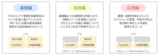 図:プロジェクト管理研修サービス 3つの階層別カリキュラム