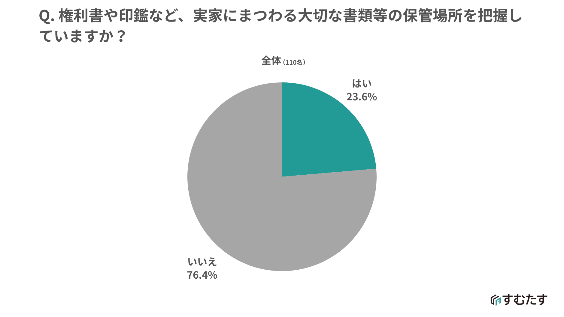 実家の売却や相続手続きにおいて必須となる「権利書(登記識別情報)」や「実印」などの保管場所について、76.4%の子世代が「把握していない」と回答しました。 いざ相続や売却が必要になった際、書類が見つからないことは手続きの遅延や紛失に伴うコスト増に直結します。不用品の片付け等はハードルが高くても、「大切な書類の場所だけは聞いておく」ことが、リスク管理として重要です。