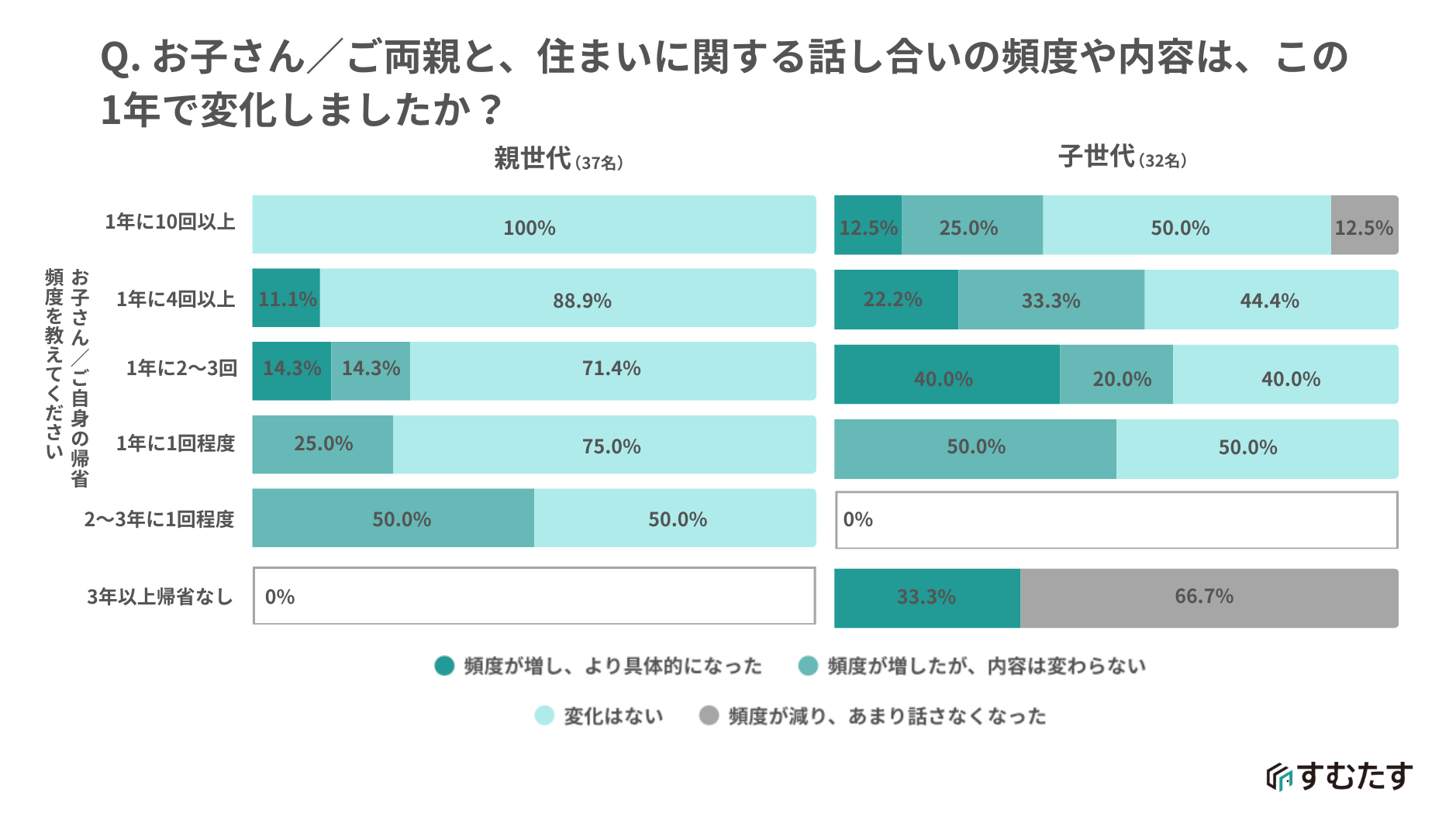 帰省頻度別に話し合いの変化を分析したところ、年に4回以上帰省している場合でも、親世代の多くは「変化はない」と感じており、子世代も「頻度は増したが内容は変わらない」という回答が目立ちました。 単に顔を合わせる回数が多いだけでは、実家じまいの話は進展しにくいことがわかります。「なんとなく話す」のではなく、意図を持ってしっかりと切り出すことが重要です。