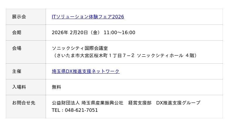 株式会社テクノア(本社:岐阜県岐阜市、代表取締役:山崎 耕治)は、2月20日に ソニックシティ国際会議室 で開催される「ITソリューション体験フェア2026」に出展いたします。