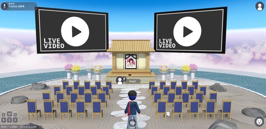 新たにオープンするイベントスペースでは、実際の葬儀会館と連動し、葬儀のLIVE映像を通じて、現実の葬儀とメタバース空間をリアルタイムでつなぎます。家族葬の増加や、地理的・身体的理由により参列が難しい方でも、メタバース上から供養に参列することが可能です。
