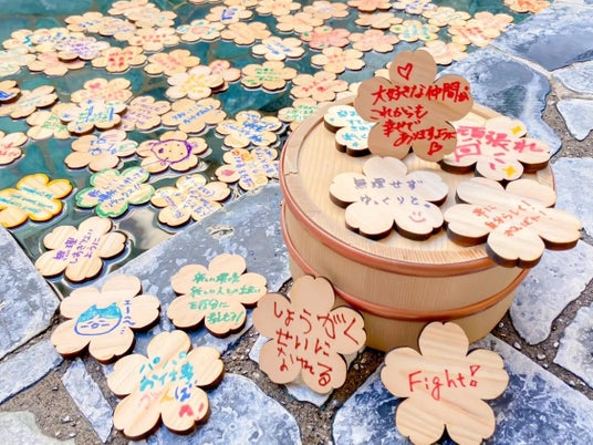 お客さまから募った、新生活へのエールが書かれた「桜型のひのき」100個をおふろに浮かべます。新しい環境への緊張を、ひのきの香りと温かいメッセージが優しくほぐします。