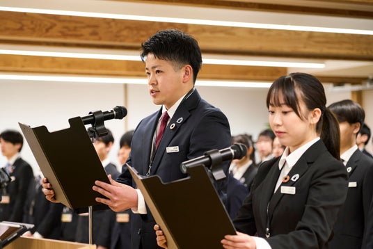 式典ではまず、代表取締役社長の加藤博昭が、社会人としての第一歩を踏み出す84人の新入社員に向けて祝辞を述べました。社長・加藤は、「木造」と「匠の心」を大切にしてきた会社の歩みに触れたうえで、「我々の仕事は、単に建物をつくることではなく、お客様の人生に寄り添い、未来を託していただく責任ある仕事」と強調。さらに、純木造マンションやビル、ホテルなど、木造では難しいとされてきた領域にも挑戦している現在を「進化のタイミング」とし、「失敗を恐れず挑戦してほしい。大切なのは挑戦したかどうか。その過程で得た学びを、自分の力に変えてほしい」と新入社員を激励しました。新入社員は緊張した面持ちから次第に表情を和らげ、これからの仕事への意欲をのぞかせていました。