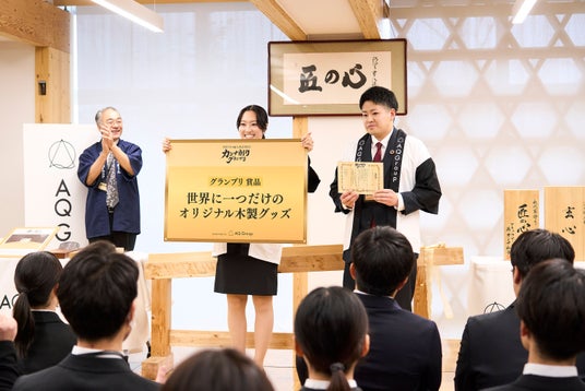 審査は「チームワーク」「代表者選出までのプロセス」「ユニークさ」など複数の観点から6つの賞を設け、6チームを各視点から評価。そのうえで、各賞の中でもとりわけ企画趣旨に沿った取り組みを見せた1チームがグランプリに。順位を競うのではなく、それぞれの個性やチームらしさを認め合いながら、最もAQ Groupらしい“匠の心”を体現したチームが選出されます。木と向き合い、仲間とつながり、「よいしょ」と声を掛け合ったチームがグランプリに選出されました。なお、グランプリチームには副賞としてオリジナル木製グッズが贈られます。