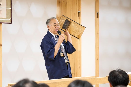 式典に続いて“元大工”である会長・宮沢が「カンナ削り」を披露。カンナ削りは、一見単純な作業に見えながら、木の状態を読み、力加減や姿勢を整えながら一気に削り出す繊細な技術です。弊社では一般的に“カンナくず”と呼ばれるものを、先人の職人たちが培った技への敬意を込めて「削り華(けずりばな)」と呼んでいます。会長・宮沢は削り華のエピソードを新入社員に紹介し「今回のグランプリは、競い合うのではなく、カンナ削りを通じて、働くことの意味や自分だけの“匠の心”を見つけてほしい」と語りました。