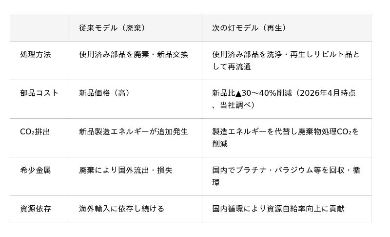 全国の整備工場・運送会社から使用済みDPF・SCR触媒を直接買い取り、自社工場で洗浄・再生処理を行い、リビルト品として再販売するとともに含有レアメタルを回収する。製造・物流・再資源化を一体で担うこの仕組みが、廃棄予定の部品を経済価値として循環させる「閉じたループ」を現場に実装してきた。