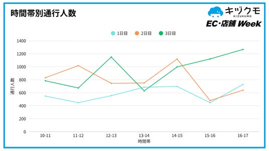 分析の結果、3日間を通じて14時から15時までの時間帯は、常に高い通行量を示す傾向がありました。このデータに基づき、ピーク時間帯に最適化したスタッフ配置を実施した結果、来場者の課題に対して迅速かつ密度の高い接客を実施することができました。